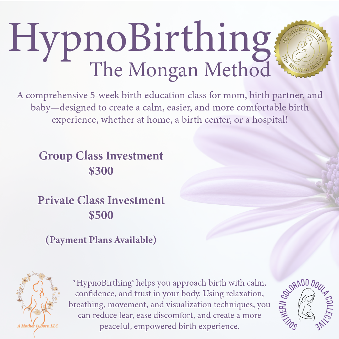 This Class is a 5 week (3 hours each) series and will go over everything from pregnancy, labor, partner support, postpartum, breastfeeding, and general newborn care! Your class investment includes a HypnoBirthing Book, Parents Planner/Workbook, Audio Tracks, and many resources sent out via email, including my personal number for check-ins and questions outside of class! Enjoy a group class and meet other expecting parents OR have a customized private class that better fits your schedule! (A $50 deposit will be required to reserve your spot)
